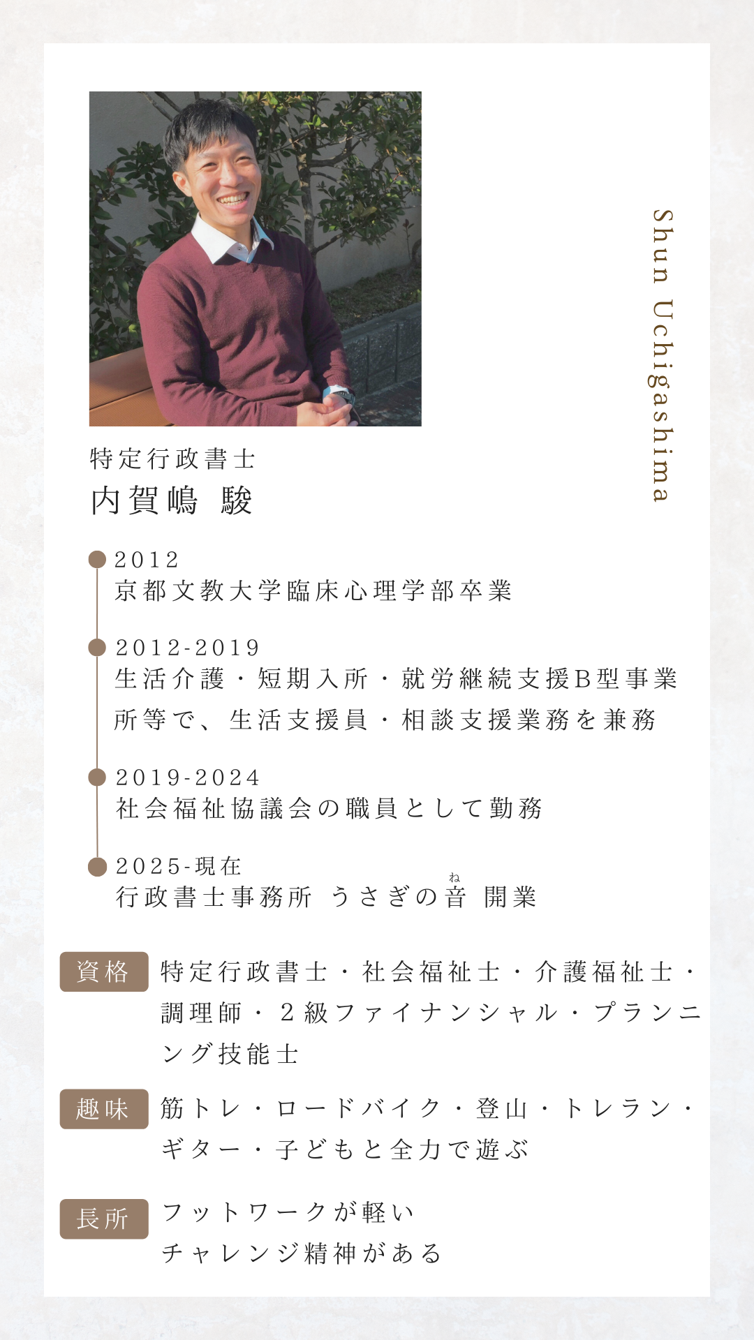 京都府宇治市にある行政書士事務所 うさぎの音、代表の内賀嶋です。